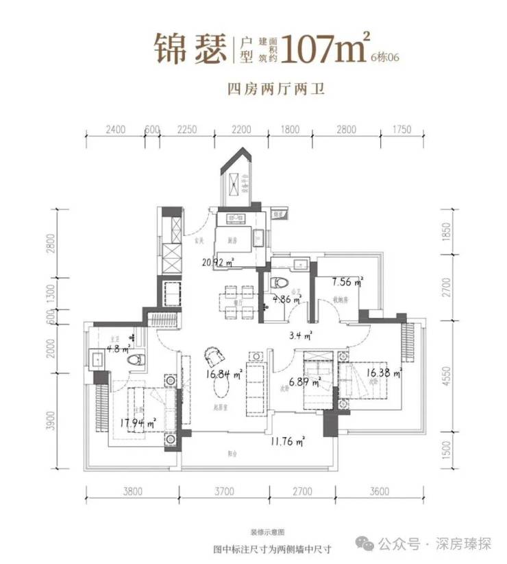 107㎡的4房2厅2卫,设计的是竖厅双龙抱珠格局,客厅3.7米开间,LDKB一体化设计,预留冰箱卡槽位,四开间朝南,主卧+2个次卧270°无柱转角飘窗,分别做到了主卧17.94㎡/次卧16.38㎡/次卧7.56㎡/次卧6.89㎡(包含墙体飘窗),U型厨房烟道外置,卫生间干湿分离,得房率约104.06%(包含赠送),客厅连接次卧出超大阳台约11.76平,东北朝向。