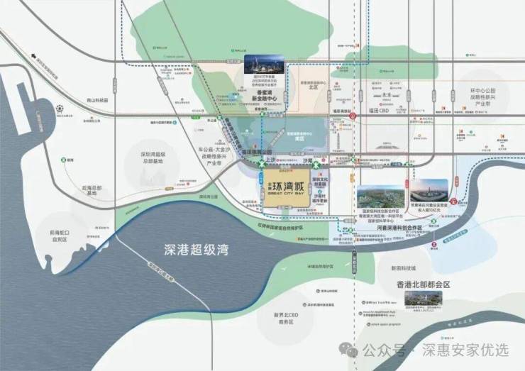 位于福田区福强路与沙嘴路交汇处,地处深港超级湾海岸线核心区域,是深圳与香港双城融合发展的关键节点。项目紧邻深圳湾公园,西南向可直面约15公里深圳湾海景和国家级红树林湿地(2023年2月列入《国际重要湿地名录》),部分高层户型可远眺香港米埔自然保护区,形成"一面城市繁华,一面山海盛景"的稀缺景观。