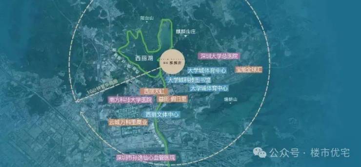 项目位于西丽度假村,旅游休闲资源丰富,主打生态景观。高层西北侧可眺望西丽湖,东南侧被深圳野生动物园(有消息称动物园原址规划为高校用地,或搬去坪山)和西丽高尔夫俱乐部环抱,远看塘朗山公园。