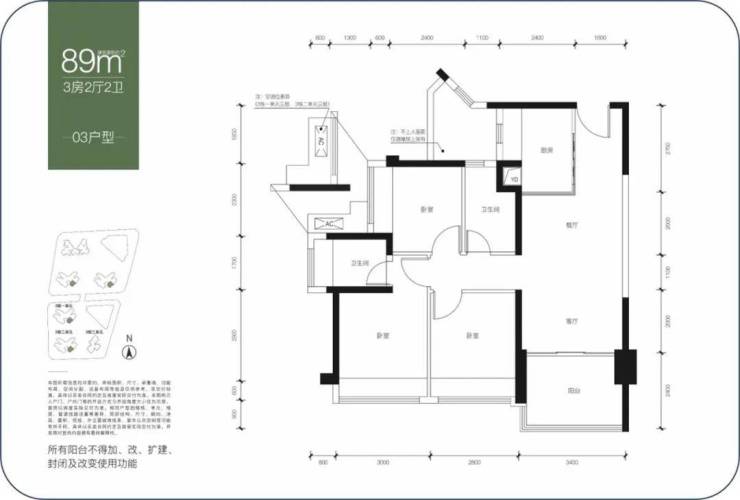 建面约89-90㎡,三房两卫,两者户型结构基本一致,都是动静分区结构,相比之下,89㎡户型动区面积小一点,90㎡是静区面积小一点,总的得房率差距很小,整体尺度比较舒适,经典实用型产品。