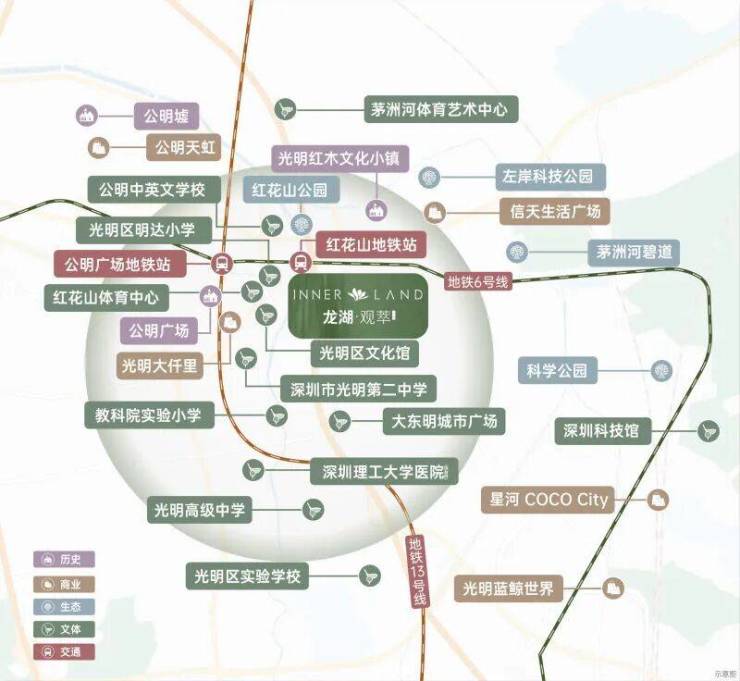 项目一平方公里范围内聚集光明历史,商业、生态,文体、交通五大城市群中极核资源。