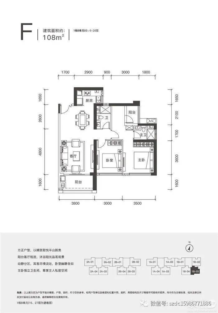 朝北向偏西,动静分区布局。户型方正空间布局科学合理。客厅开间3.8米带有1.65米进深景观阳台。主次卧方正居住空间较为舒适。相对108㎡F户型来说不用担心景观遮挡的问题。