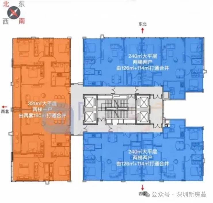 320㎡实际上是由两套160㎡原始户型合并而成,240㎡是由126㎡和114㎡打通合并而成。320㎡是两梯一户,240㎡是两梯二户。