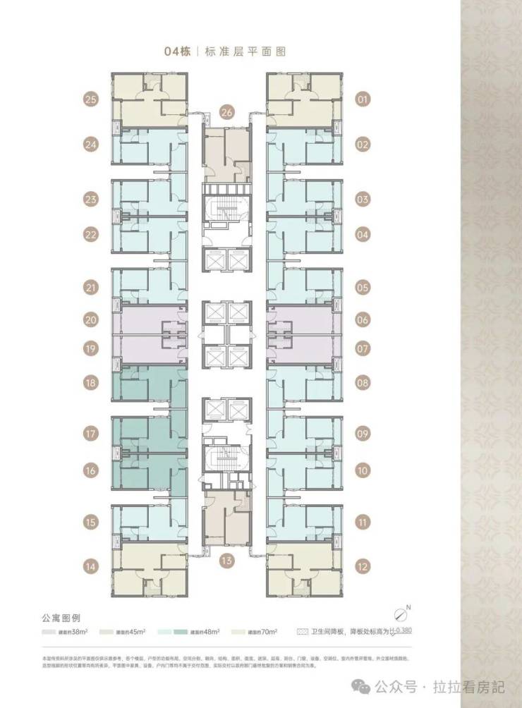 住宅由4栋48层建筑组成,分别是1栋、2栋1/2单元和3栋,3梯5/6户,4栋是商务公寓45F(1470户),5栋是幼儿园。