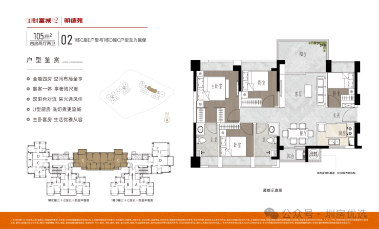 财富城明德苑,总占地面积约1.18万㎡,总建筑面积约9.89万㎡,计容建筑面积约7.64万㎡,容积率6.45,绿化率35%,共规划2栋4座32-54层高的住宅,其中1栋A/B座住宅32F,1栋C/D座住宅54F,规划有4950㎡商业。