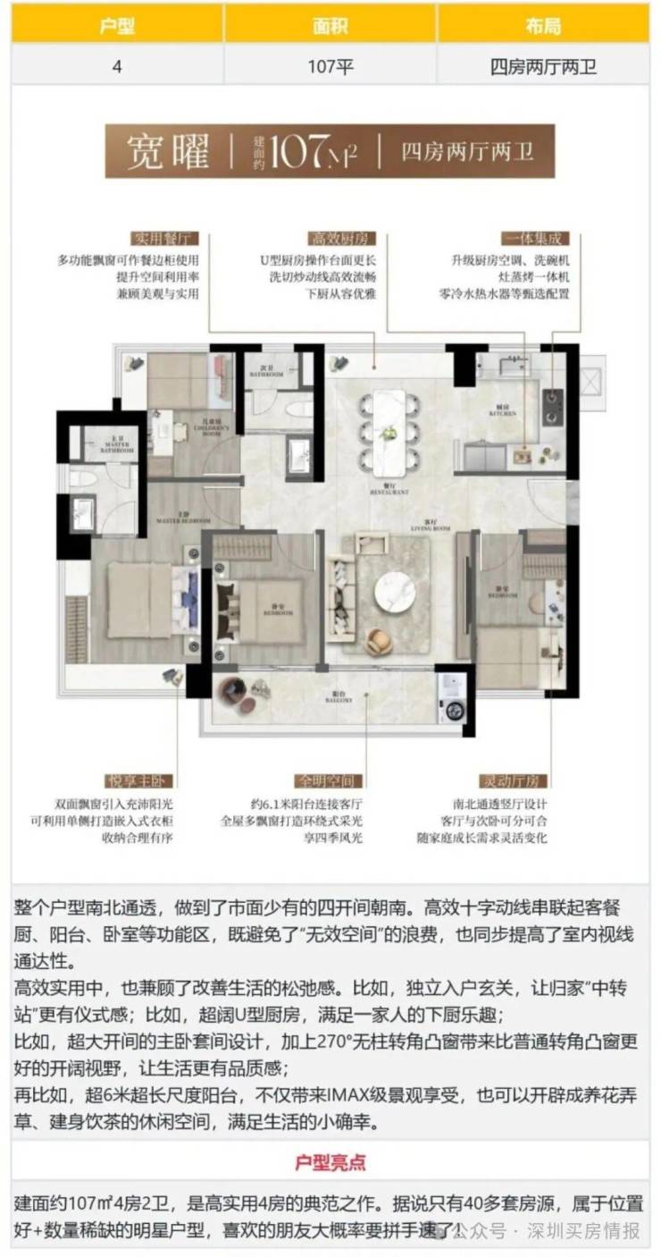 107㎡的4房2厅2卫,设计的是竖厅南北通透格局,客餐厅分离设计,四开间朝南,主卧270°转角飘窗,U型厨房,公卫三段式干湿分离,得房率约90%(包含赠送),客厅连接餐厅出6.1米长的大阳台,西南朝向。