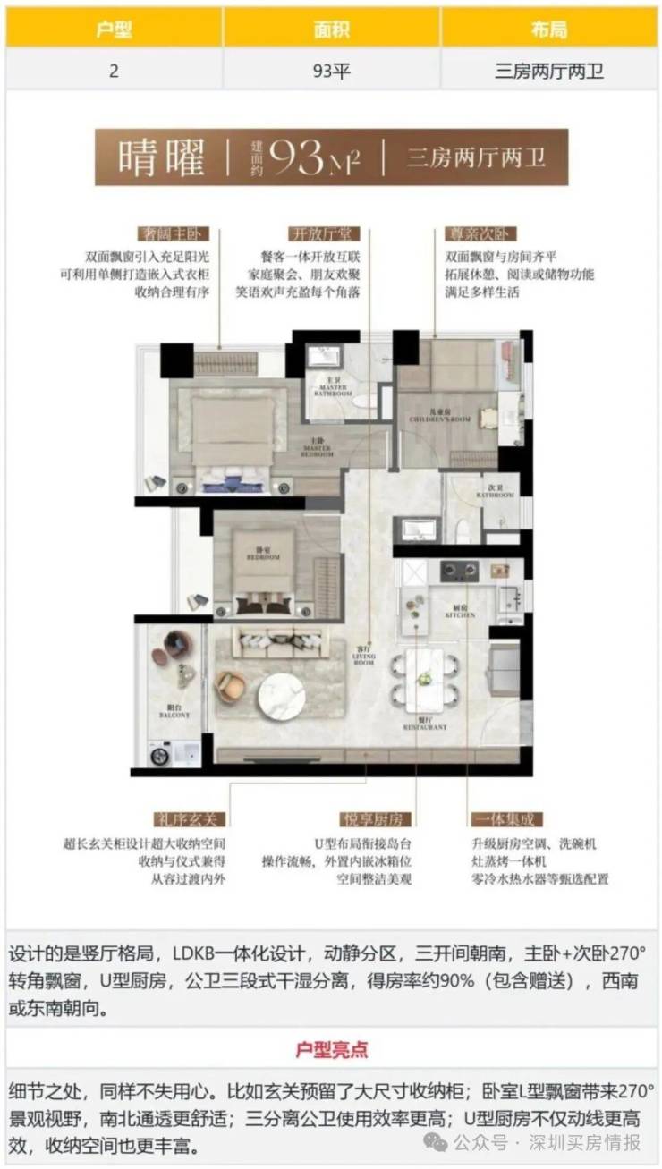 93㎡的3房2厅2卫,2栋1/2单元05户型/2栋3单元02户型,设计的是竖厅格局,LDKB一体化设计,动静分区,三开间朝南,主卧+次卧270°转角飘窗,U型厨房,公卫三段式干湿分离,得房率约90%(包含赠送),西南或东南朝向。