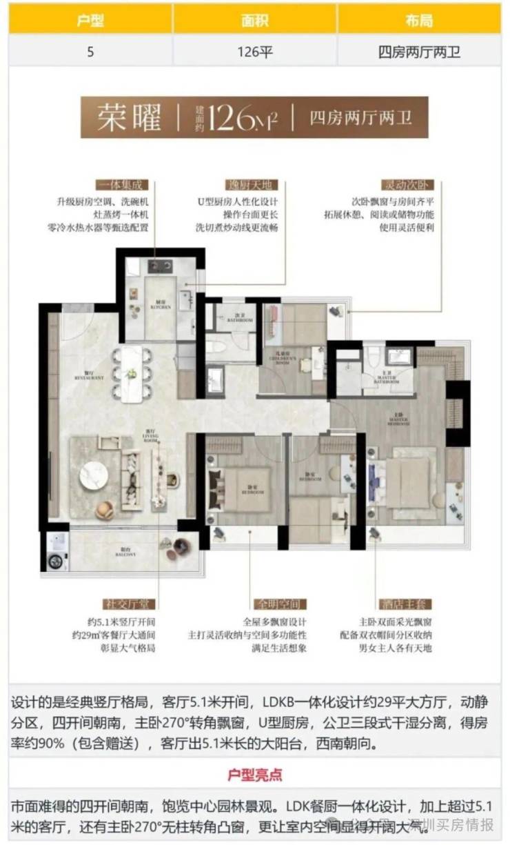 126㎡的4房2厅2卫,设计的是经典竖厅格局,客厅5.1米开间,LDKB一体化设计约29平大方厅,动静分区,四开间朝南,主卧270°转角飘窗,U型厨房,公卫三段式干湿分离,得房率约90%(包含赠送),客厅出5.1米长的大阳台,西南朝向。