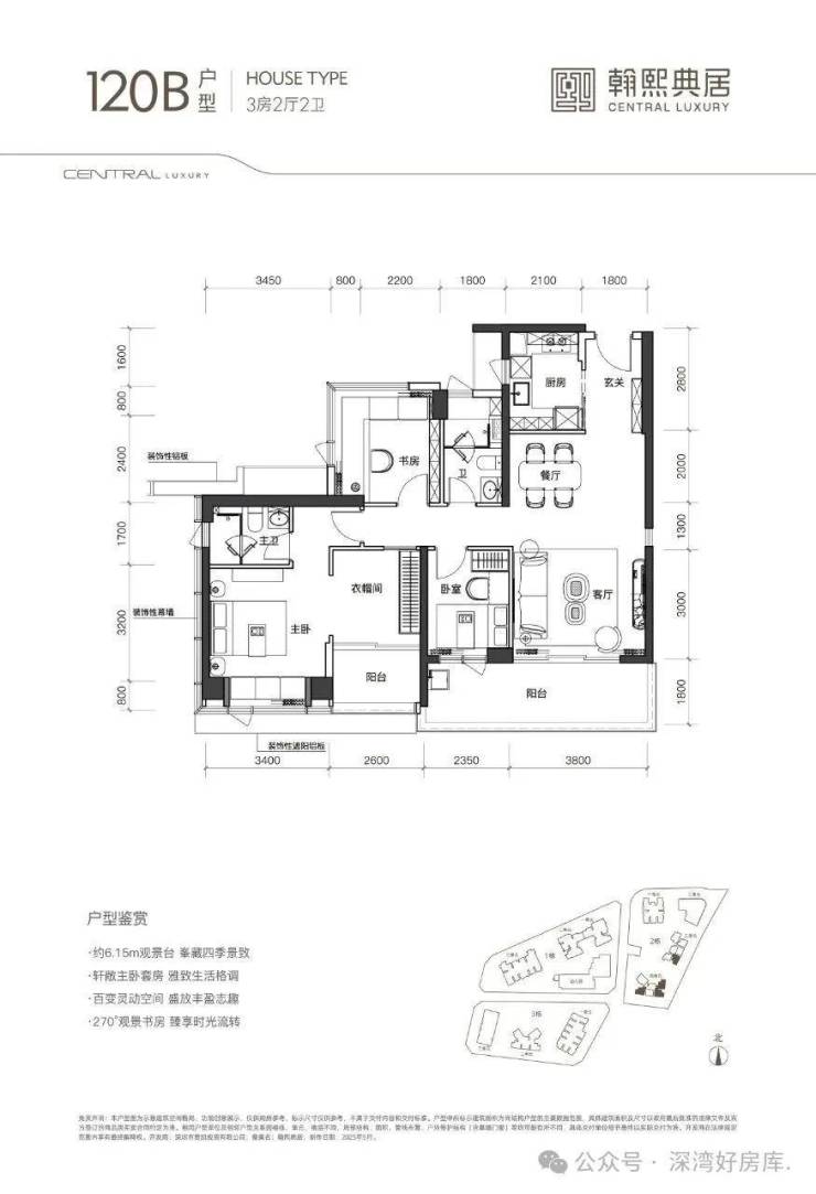 105-120㎡三房:竖厅或双龙抱珠格局,6.5米阳台,得房率约90%,折后总价894万起。