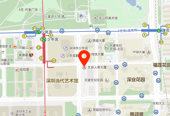 公交:少年宫东、深业花园、天健世纪花园少年宫、市民中心东、关山月美术馆、武警支队、市民中心、莲花中学,34路、64路、371路、m459路、41路等多条公交线路。