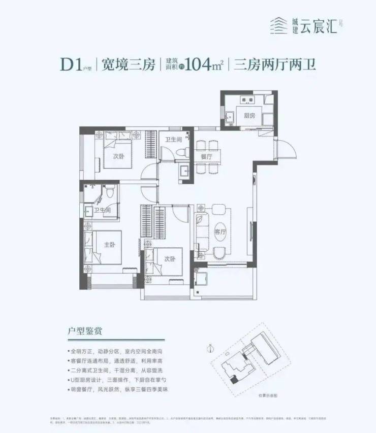 104㎡的3房2厅2卫,设计的竖厅南北通透格局,餐客厅一体化,U型厨房,阳台西南朝向。