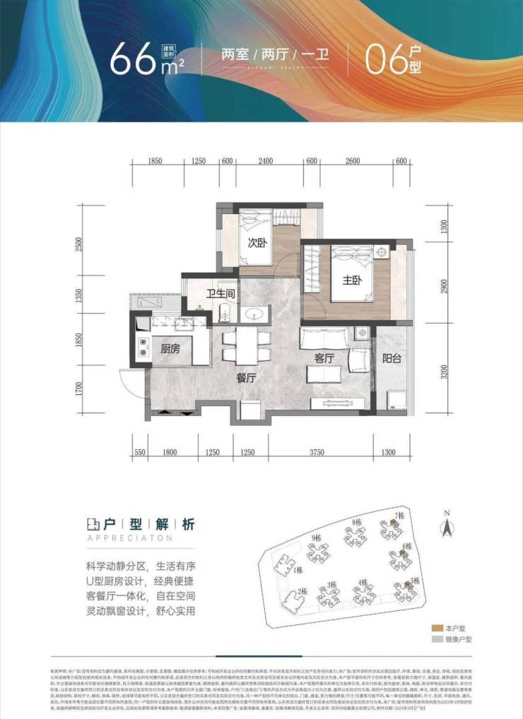 建面约66㎡ 2房2厅1卫:南北通透,全凸窗设计,开放式U型厨房