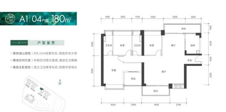 面积段:50㎡的1房1厅,70-85㎡的2房1厅,95-105㎡的3房2卫,120-150-180㎡的4房2卫户型