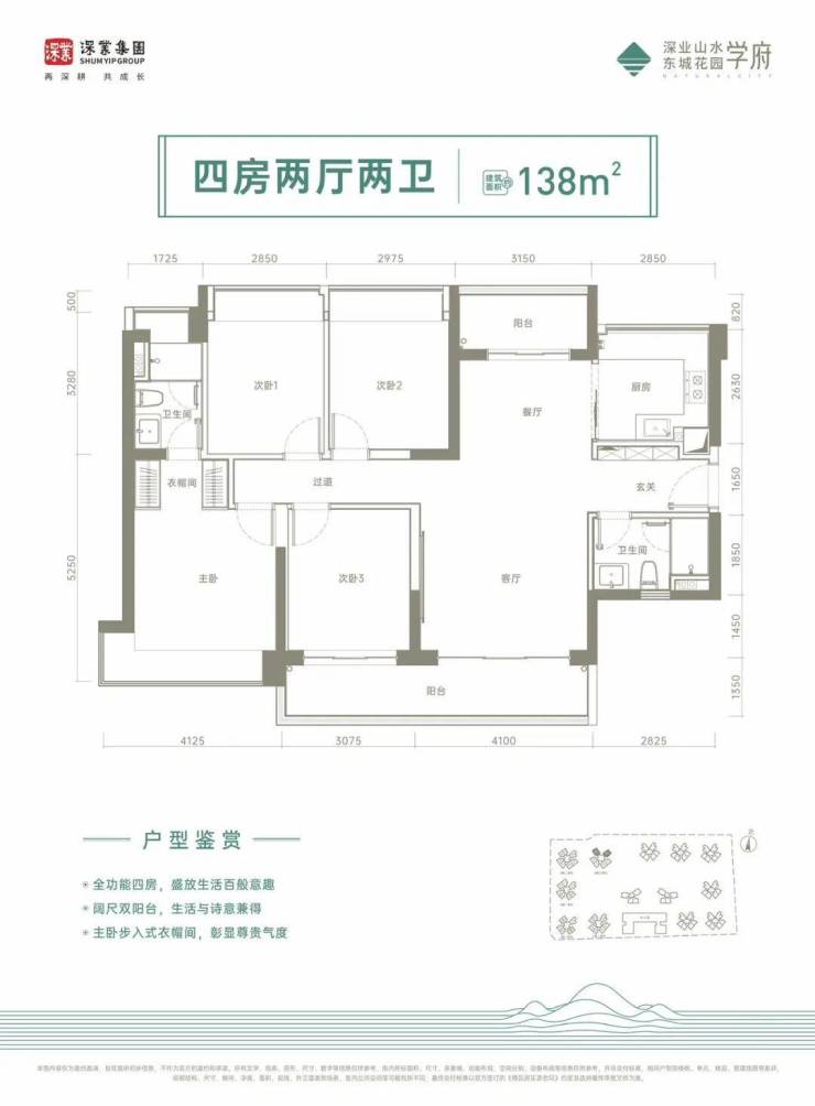 138㎡的4房2厅2卫,设计的是竖厅南北通透格局,进门入户玄关,客厅4.1米开间,南北通透双阳台,4个卧室分别做到了4.125米/3.07米/2.97米/2.85米的宽度,主卧大套间设计,客厅连接次卧出7.17米长的大阳台,U型厨房,卫生间干湿分离,得房率:75%(不含赠送),阳台主朝西南或东南向。
