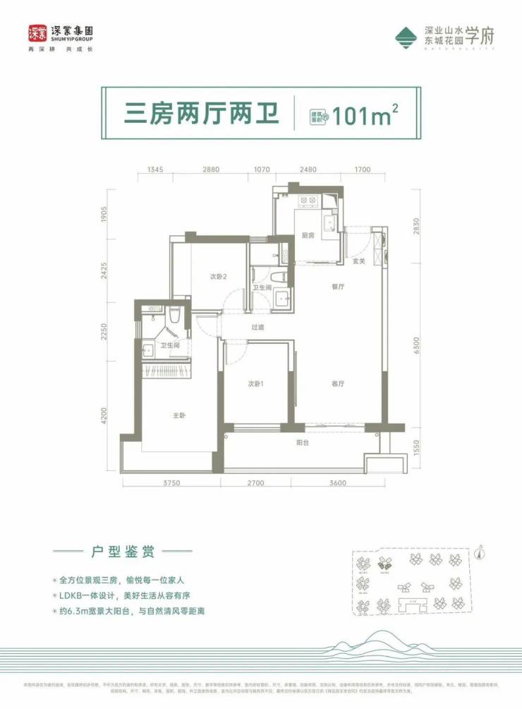 101㎡的3房2厅2卫,设计的是经典竖厅格局,进门入户玄关,客厅3.6米开间,LDKB一体化设计,三开间朝南,3个卧室分别做到了3.75米/2.7米/2.42米的宽度,客厅连接次卧出6.3米的大阳台,U型厨房,卫生间干湿分离,得房率:75%(不含赠送),西南或东南朝向。