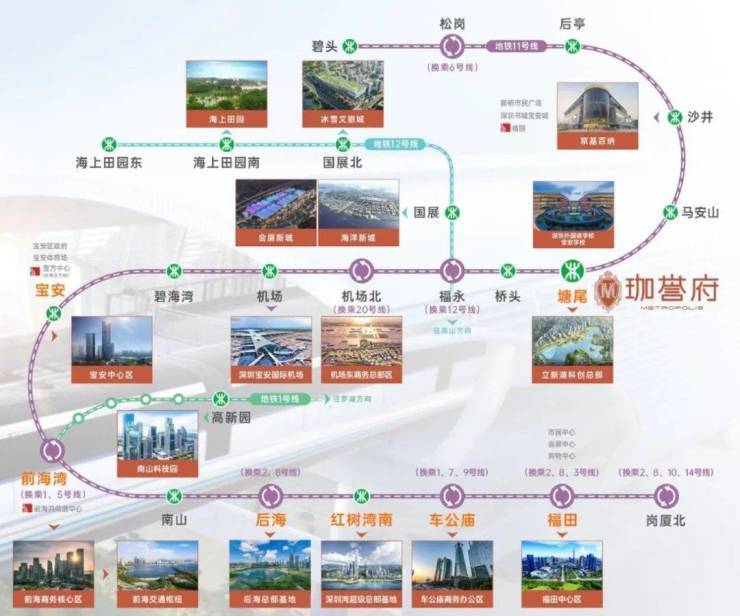 直连11号线塘尾站,6站宝中地铁:无缝连接11号线塘尾站,6站到宝中、7站到前海、9站到后海、11站到车公庙,便捷到达南山、福田