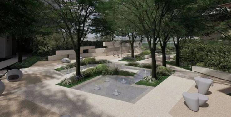 约400㎡无界亲子多元互动型泳池,与7栋架空层联动,在架空层内布置淋浴更衣、消毒池等功能,与周边绿化融合,无硬边界,绿植做隔断,旁边设置跌水景观。