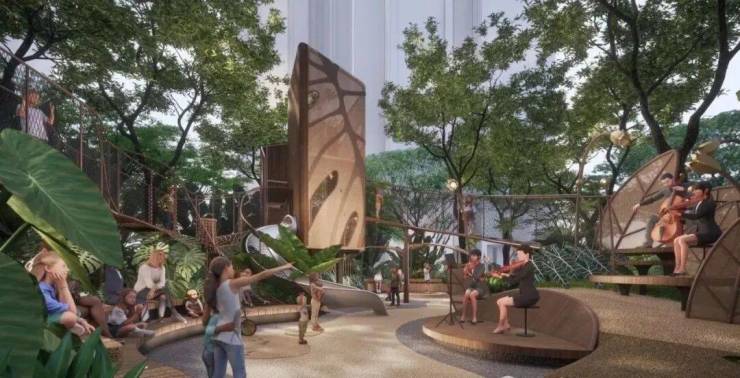 约1500㎡规模,营地以大叶王国为主题,将生态教育、艺术文化结合成为自然探索乐园、游乐场为一体的多元活动场景。同时于6栋架空层相连,配置儿童自由玩耍的空间。