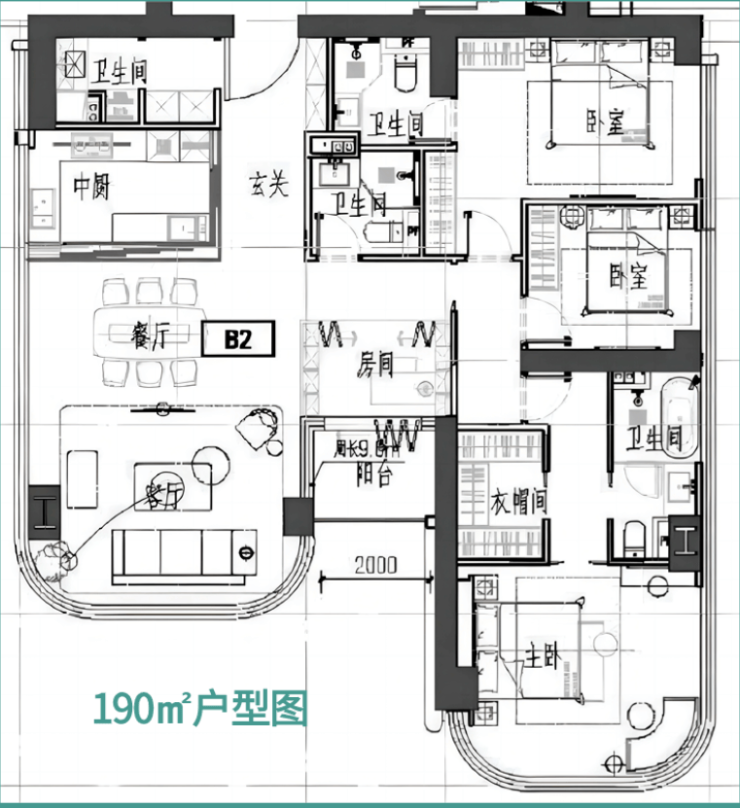 190㎡做3+1房属实差点意思,没有正式的四个房间。另外四卫显得有点多余,进门旁边的公卫可以利用成储物间或其他用途。