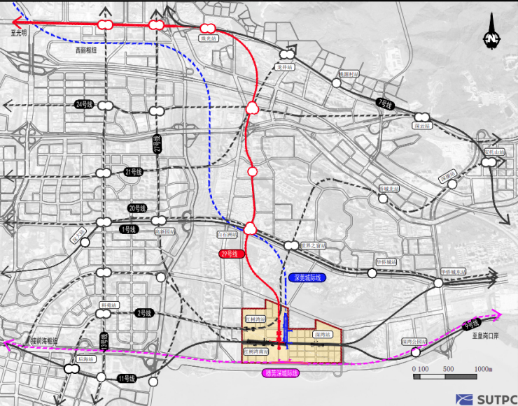 一是明确引入城市轨道29号线、莞深城际线和穗莞深城际线,打造6线6站枢纽并围绕枢纽实现地下负一层慢行全连通。二是多措并举提升常规公交设施及服务,根据超总实际需求设置多样化、规模适宜的场站,包括常规公交场站、班车、出租车、旅游巴士等,场站布局时减少对城市立面的影响。同时,结合滨海大道辅路下沉设置一对地下港湾式公交中途站。三是压缩停车配建与需求管理相结合,未出让地块按深标下限70%配建,并通过费用、时段、预约管理等调控需求。四是精简地下道路规模,并采用匝道汇入管控、分级诱导等智慧交通手段确保运维高效安全。
