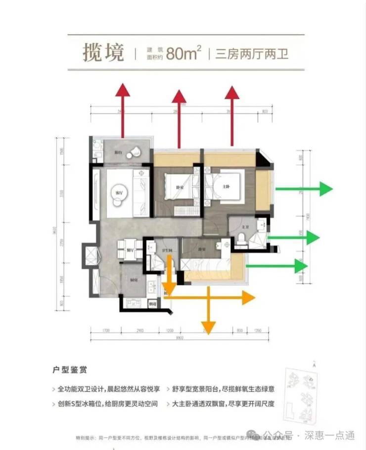 黄色箭头呢也是这里最需要注意的一点小次卧飘窗,客厅卫生间对出去是80平米的墙体还好不会对视就是遮挡问题,就是客厅飘窗有点尴尬对出去是80平米的两个卫生间