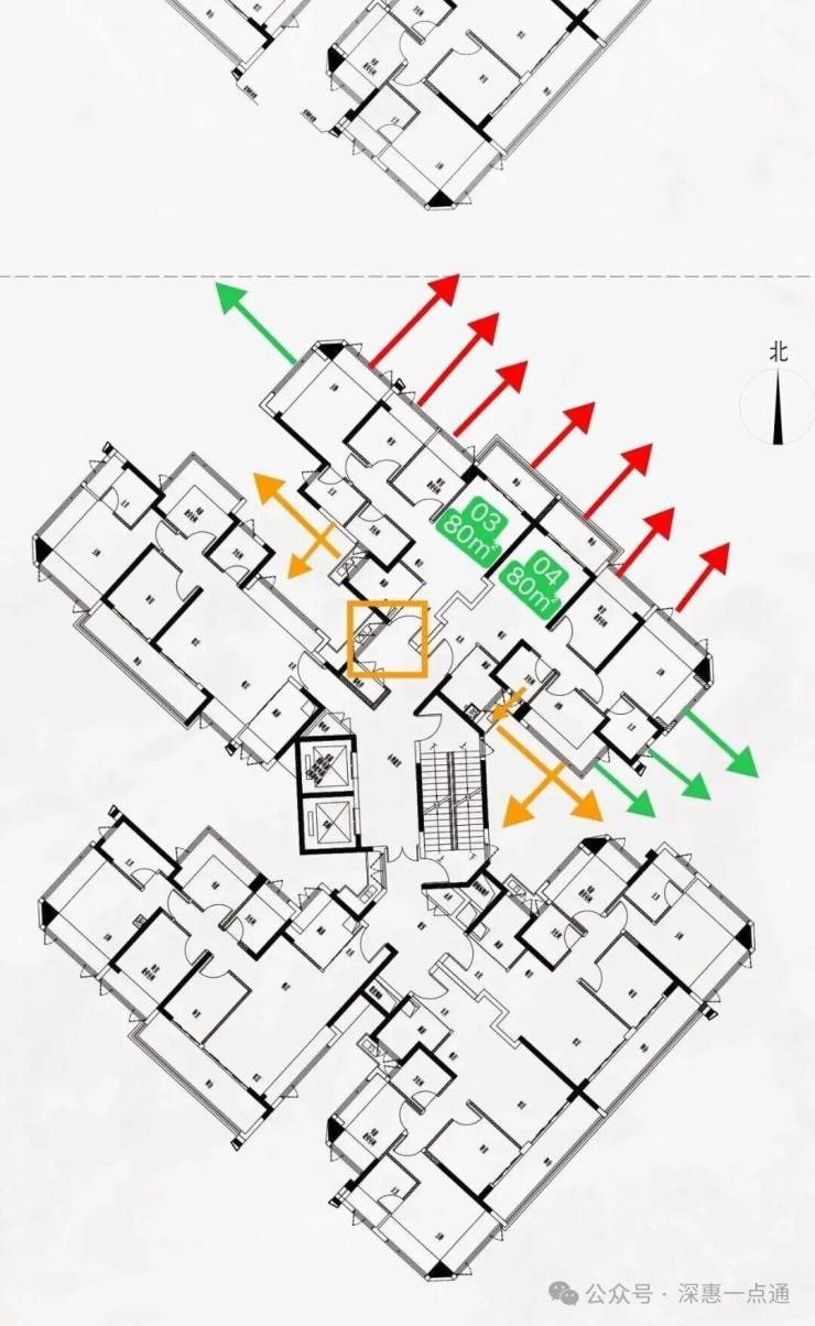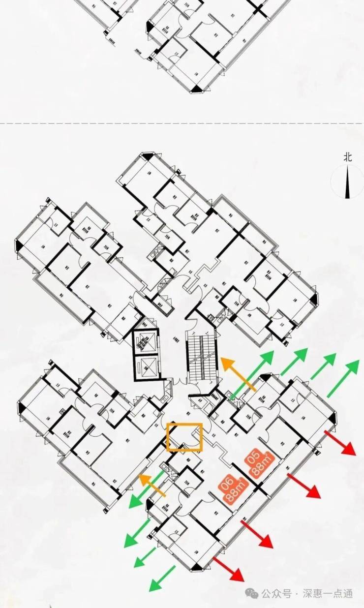 最后再来说一下黄色箭头情况这里是比较需要注意的点这里可以看一下这个楼栋平面图,其中书房次飘窗,客厅卫生间看出去是天井墙体,所以书房做了是双面采光这里还好,卫生间可能影响一点,客厅飘窗也会有跟06户型88平米的书房对视遮挡问题,这里后续可以通过其他问题解决
