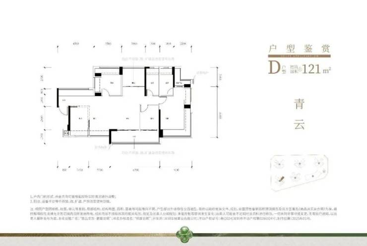 121㎡的4房2厅2卫,设计的是横厅南北通透格局,进门赠送约4.2㎡的前室入户,独门独户,客餐厅6.35米开间,4个卧室分别做到了主卧21.37㎡/次卧10.22㎡/次卧10.19㎡/次卧7.39㎡(实测面积,去掉墙体),主卧+1个次卧270°飘窗,客厅连接次卧出6.3米长大阳台,L型厨房,得房率约79.45%(不含赠送),阳台主朝西南或东南向。