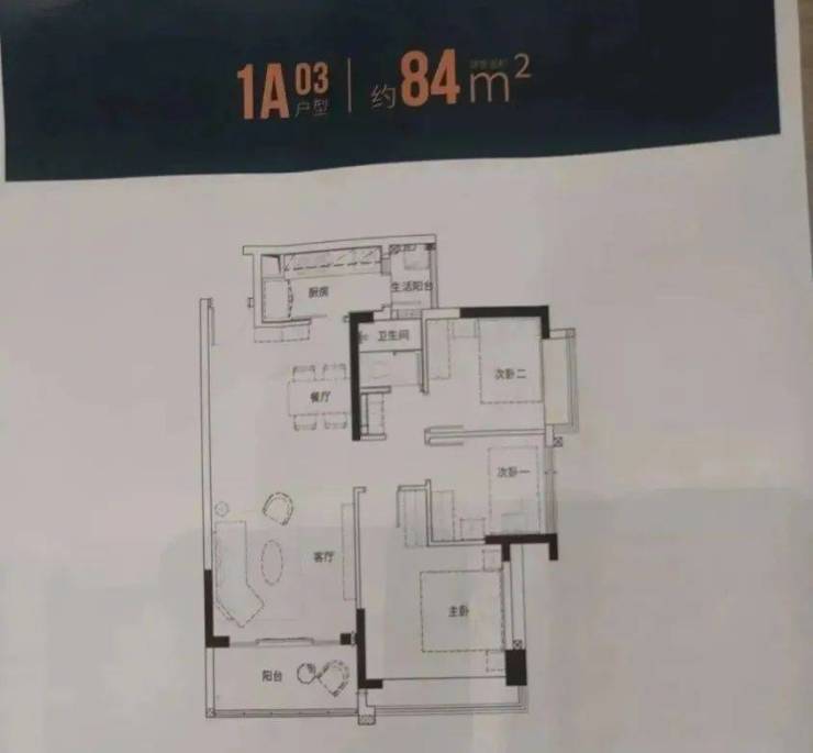 84㎡的3房2厅1卫(1栋A座03户型),设计的是竖厅格局,客厅3.6米开间,动静分区,一字型型厨房,还带1个小生活阳台,卫生间三段式分离设计,得房率:79.62%(不含赠送),阳台东南朝向。