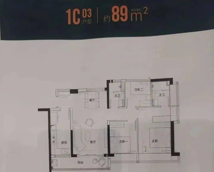 89㎡的3房2厅2卫(1栋C座03户型),设计的是竖厅南北通透格局,客厅3.6米开间,动静分区,主卧大套间设计,超大L型厨房,得房率:77.27%(不含赠送),阳台主朝东南向。