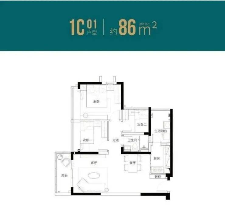 86㎡的3房2厅1卫(1栋C座01户型),设计的是竖厅格局,客厅3.6米开间,动静分区,三开间朝南,L型厨房,还带1个生活阳台,得房率:77.27%(不含赠送),阳台西南朝向。