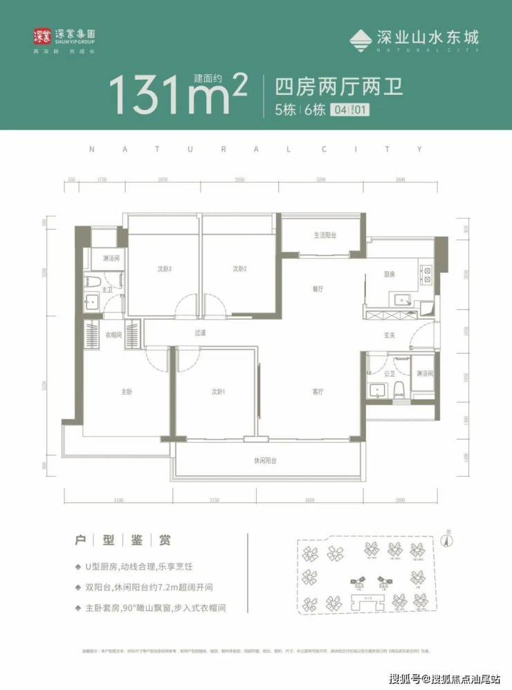 设计的是竖厅格局,客厅4.05米开间,南北通透双阳台,4个卧室分别做到了4.1米/3.15米/2.95米/2.85米的宽度,主卧大套间设计,长7.2米的大阳台,U型厨房,卫生间干湿分离,得房率:79.37%(不含赠送),阳台主朝西南或东南向。