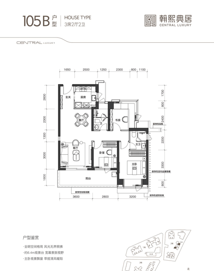 该户型为 02 地块的唯一一条腿,非常稀缺。户型南北通透,带大主卧套房的奢居型三房。带 5.4m 观景台,大横厅奢阔空间设计,主卧同客厅阳台、餐厅三面宽朝西南。北向双次卧、双卫生间、拓展空间共五面宽一字排开,视野全面俯瞰社区内园林,静谧舒适。