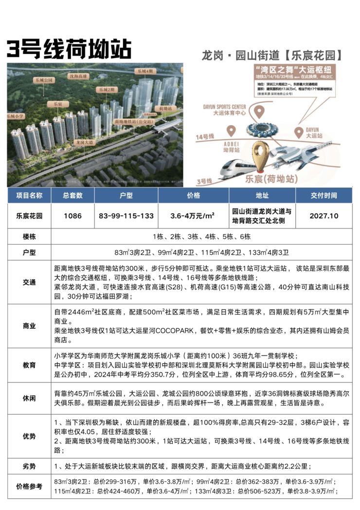 2、距离地铁3号线荷坳站约300米,1站可达大运站,可换乘3号线、14号线、16号线等多条地铁线路。
