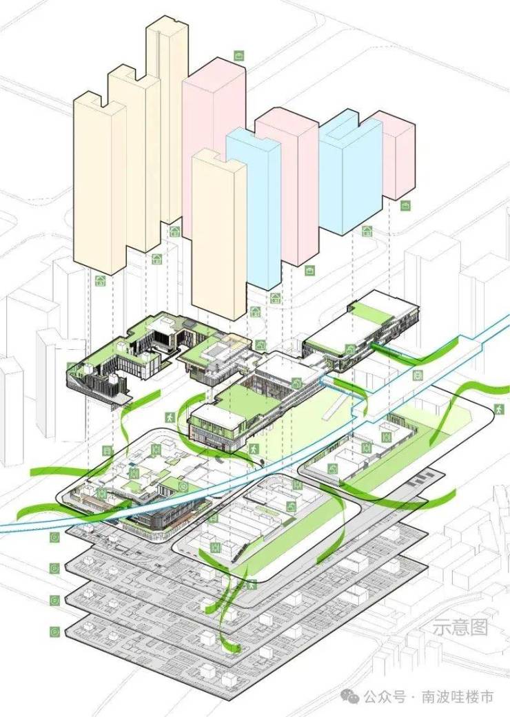 垂直交通场景:多首层设计,空中连板、无风雨连廊等,形成住宅、商业、办公与地面公交、空中地铁的接驳体系。