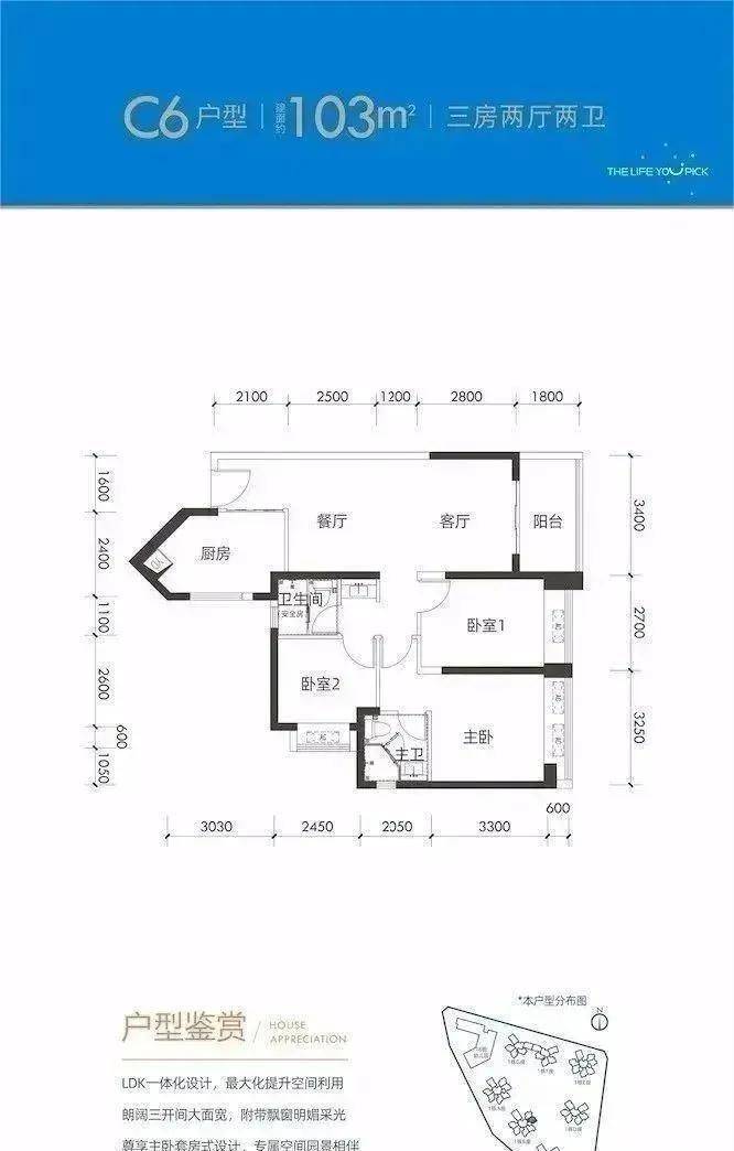 约100-107平的三房户型,三开间全部朝南,通风采光无死角,尽享阳光的宠溺。