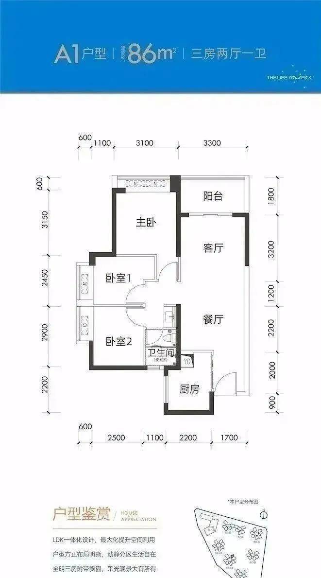 建面约86㎡3房2厅1卫户型,标准大三房的格局,经典的竖厅设计,非常适合首置的购房者,整个空间兼具实用性与舒适性。