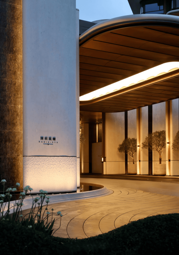 观潮府主大门位于地块东侧,遵循东方礼制 “迎宾 — 入境 — 归家” 三重仪式,是项目第一视觉豪宅门面,整体极简大气、融合滨海现代美学。主入口大门整体横向舒展超宽幅界面,极简线性金属 + 石材幕墙,无多余繁复装饰,匹配前海国际 CBD 气质;对称式构图,两侧弧形石材立柱 + 中央通透玻璃雨棚,方正庄重、威仪感极强;东向主入口纳紫气东来,门头抬高设计,与城市道路形成高差尊贵感。