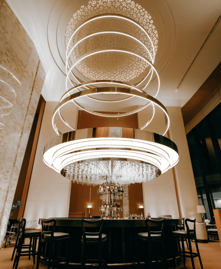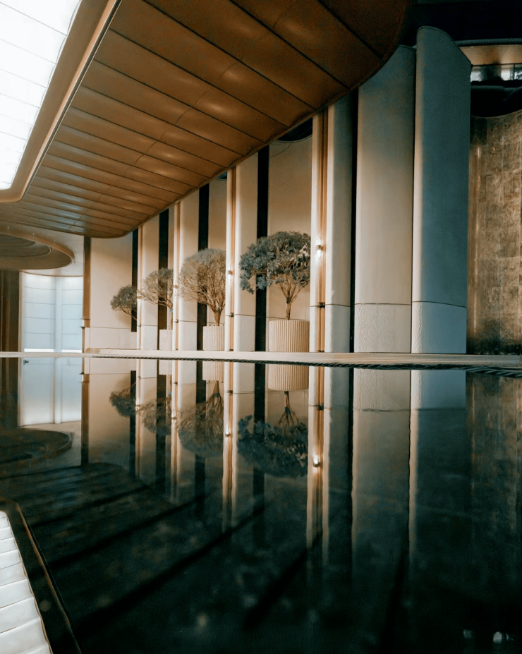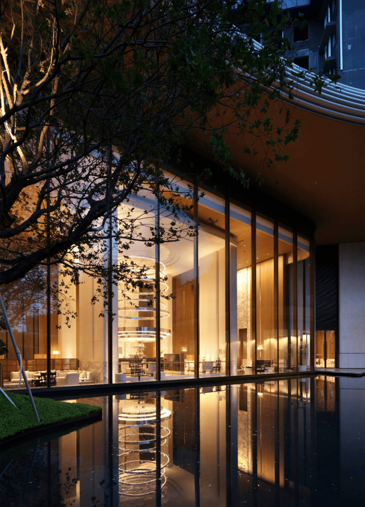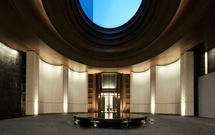 大门内侧直达9 米超高挑高车马厅,豪宅标配落客仪式,车行直达地下、人行步入园林完全分流;穹顶弧形天花 + 嵌入式灯光系统,中央镜面水景,藏风生水起之意,光影静谧高级。