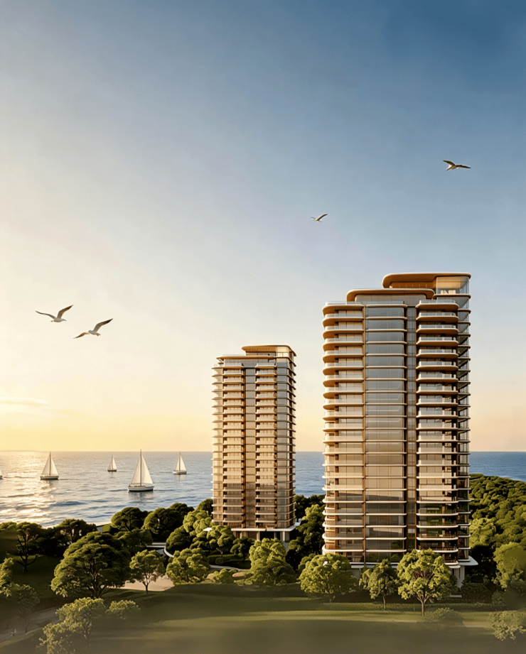 观潮府建筑立面官方设计主题:时代风帆,是项目最具辨识度的城市天际线标志。整体极简现代、无多余造型,挺拔优雅、质感高级,区别于传统欧式豪宅,是属于深圳前海的国际滨海现代立面。竖向金属线条如千帆竞发桅杆,挺拔向上;横向玻璃幕墙随光影流转,与前海潮汐同频共振;白天通透干净、夜晚灯光璀璨,是前海天际线标志性建筑。弧形玻璃幕墙 + 竖向氟碳喷涂铝合金线条 + 大面积铝板幕墙,高端耐久、抗盐蚀耐海风;全圆弧倒角玻璃,柔和流畅,呼应海浪弧度,同时提升观景视野;超大弧形观景阳台,逐层退台设计,立面富有韵律层次。