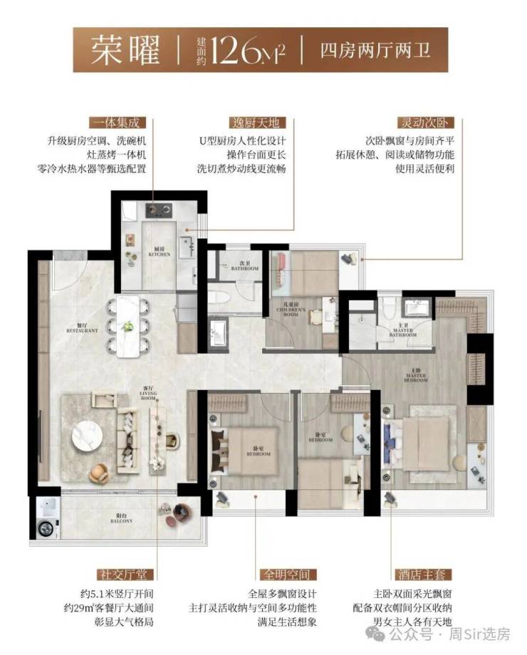 l颜值臻配:升级配置超大玄关柜、内嵌冰箱、灶蒸烤一体机、零冷水热水器、中央空调及厨房空调、轻松抽橱柜、双向流新风,以一体集成的精工美学,实现功能与颜值的并存。