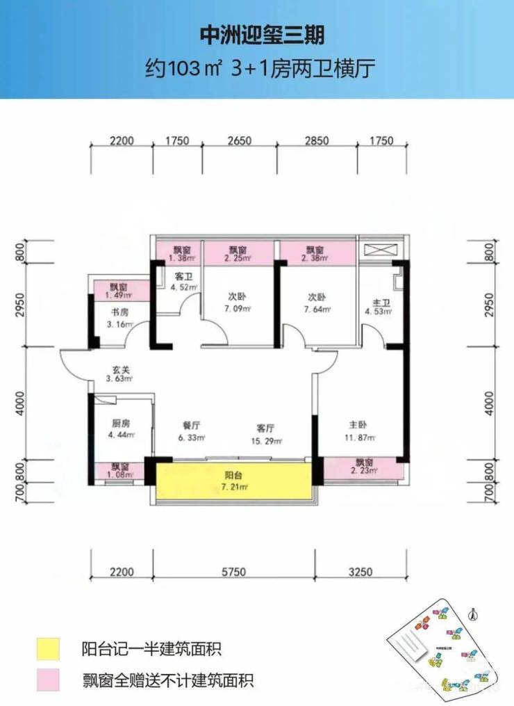 104㎡的4房2厅2卫,设计的是横厅南北通透格局,进门入户玄关,客餐厅5.75米开间,LDKB一体化设计,四开间朝南,4个卧室分别做到了主卧14.1㎡/次卧10.02㎡/次卧9.34㎡/次卧4.65㎡(包含墙体飘窗),客餐厅出7.21米长的大阳台,U型厨房,卫生间干湿分离,赠送面积高达14.41㎡,阳台主朝正南或东南向。