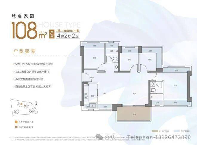 108平四房两厅两卫,约6.1米社交大横厅,采用LDK一体化设计,将客厅、餐厅、厨房彼此视线相融,强调了社交空间的灵活多变。