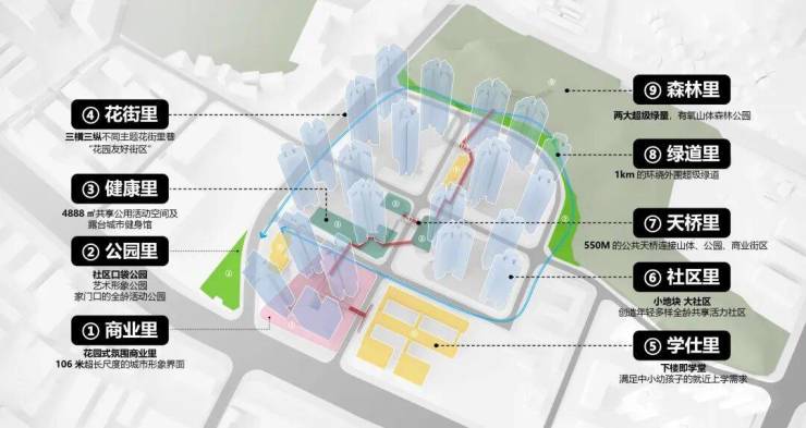 项目规划了约500米的立体城市连廊系统,串联全龄教育、精致商业、品质人居、活力运动、公园休闲等功能板块。