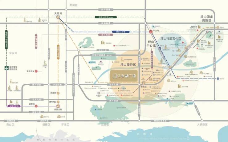 立体交通,坪山门户双大道头排:雄踞坪山大道与锦龙大道双头排;坪盐通 道、南坪快速、东部过境高速(在建)高效出行。