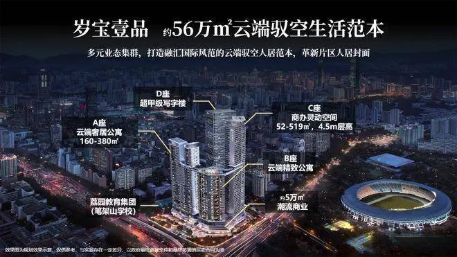 岁宝壹品位于福田区八卦岭片区的“C位”,项目分为两期开发,总建筑面积超50万平方米,汇集包含超甲级写字楼、(建筑面积约)5万平方米高端商业与顶级公寓等多种业态,打造为融汇国际风范的云端都会垂直生活体,全方位配套,满足不同商务场景的即刻切换。尤其令人期待的是,150米高空的(建筑面积约)6000平方米云端会客厅,配置健身房、无边际泳池、观景露台等圈层私享会所,在深圳实属罕见。