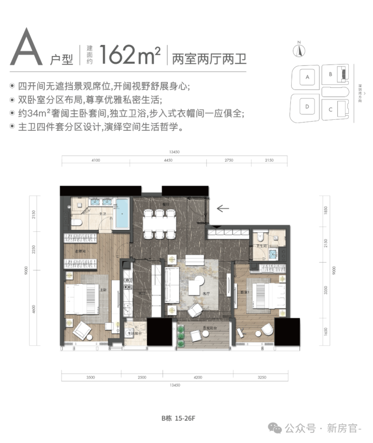产品分段分布,162-164㎡户型分布在15-26层,223㎡以上户型分布在28-52层。