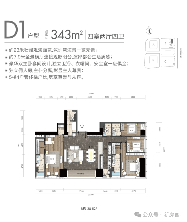 东向大户型拥有优秀的视野景观,大开间短进深双面采光室内通风采光能力优秀,主要生活空间拥有深圳湾海景;餐客厅开间3.9米带有有大型观景阳台;三套间双主卧配置,空间宽敞舒适独立全面;大型餐厨空间品质优秀,独立工人休息间带有卫浴;340㎡户型产品与343㎡户型结构类似,次卧南向日照充足,但工人房没有配备洗手间。