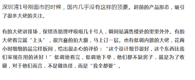 为什么?自信来自稀缺,深圳湾1号卖一套少一套,当然要挑业主。光有实力不够,还要看是不是相互认同,能不能双向奔赴。