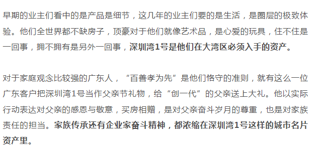 深圳湾1号让精英们趋之若鹜的原因,是“懂得赚有钱人的钱”。就像上面那位“中国巴菲特”形容的,财务自由了,遇到触动灵魂的东西,绝不能错过,绝不能留遗憾。
