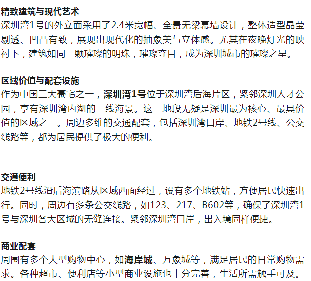 深圳湾1号不仅是一座豪宅,更是居住者身份与品味的象征。这里融合了顶级地段、尊享服务与卓越配套,成就了无数人心中的理想家园。深圳湾1号,不仅让您拥有一个家,更为您提供了一个尊贵、奢华、无与伦比的生活方式。